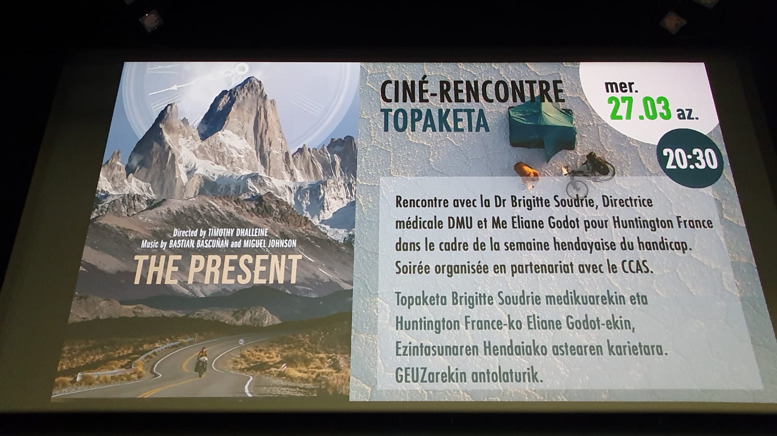Nous avons projeté le documentaire au cinéma de Hendaye, en France, en partenariat avec l’Hôpital Marin de Hendaye, dans le cadre de la Semaine du handicap. Cet hôpital dispose d’un service de soins dédié à la prise en charge des patients atteints de la maladie de Huntington.